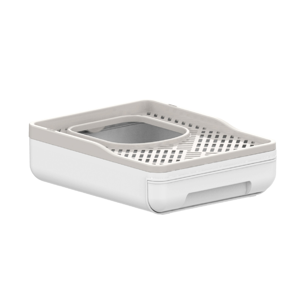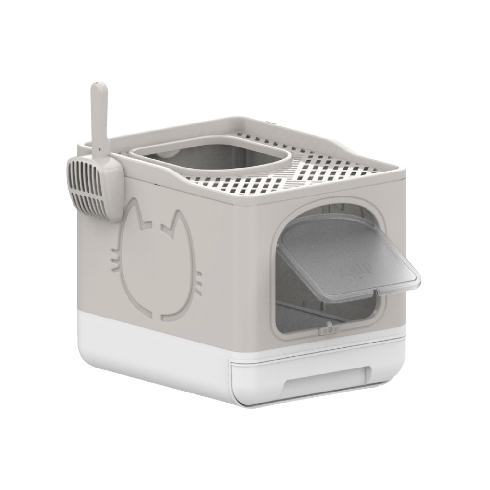 Next-generation cat litter box. It features two types of entries, a side door and an open top, to meet all your cat's needs. The front entry can be locked for added security. Easy to store, clean, and transport. Color: Beige.