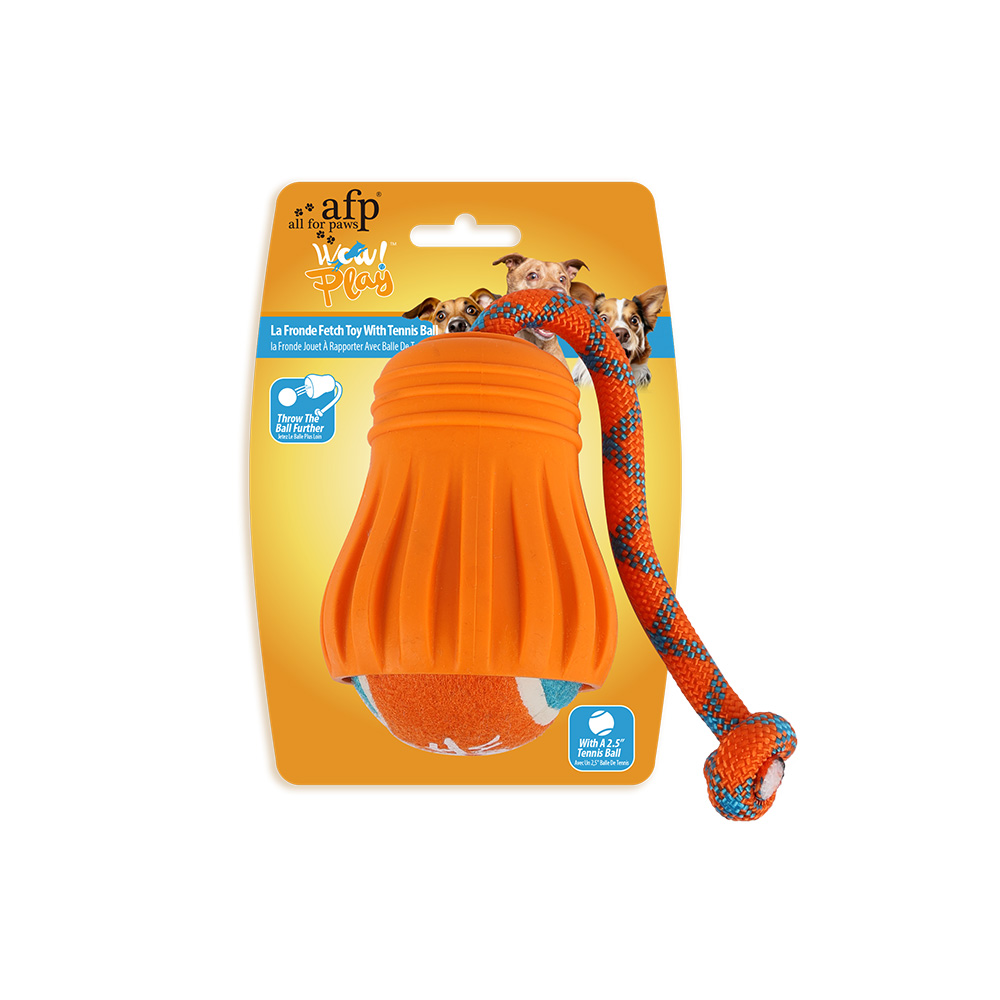 Interactive dog toy with ball and rope that encourages play and provides mental and physical well-being.