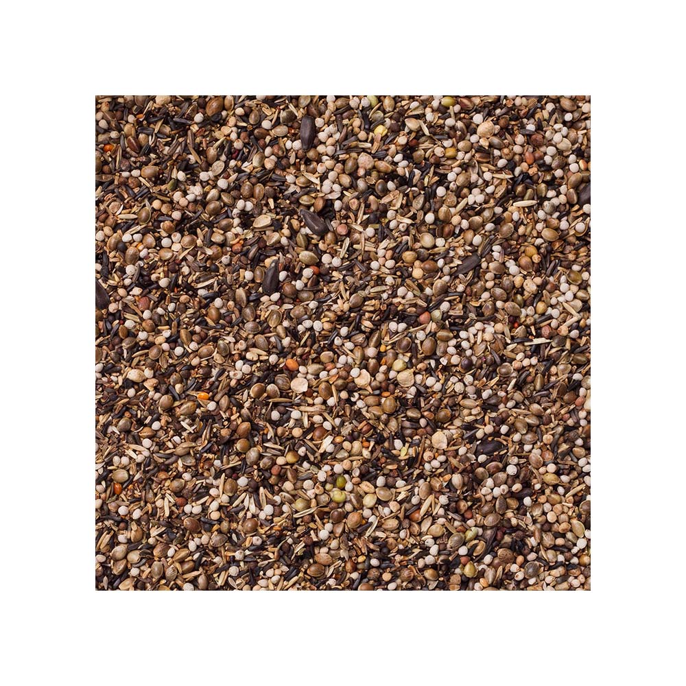 A finely-milled, high-quality mixture for goldfinches, including the European goldfinch, Siberian goldfinch, and Himalayan goldfinch. Only the best seeds are selected for inclusion in these unique mixes. The large variety of special seeds, including chicory, evening primrose, black and white lettuce seeds, white and brown perilla, and black sunflower seeds, ensures that this mixture will be well-liked by your birds and guarantees complete absorption of this high-quality mix. The mixture is energy-rich due to the high quantity of niger and hemp seeds. Complete Animal Food.