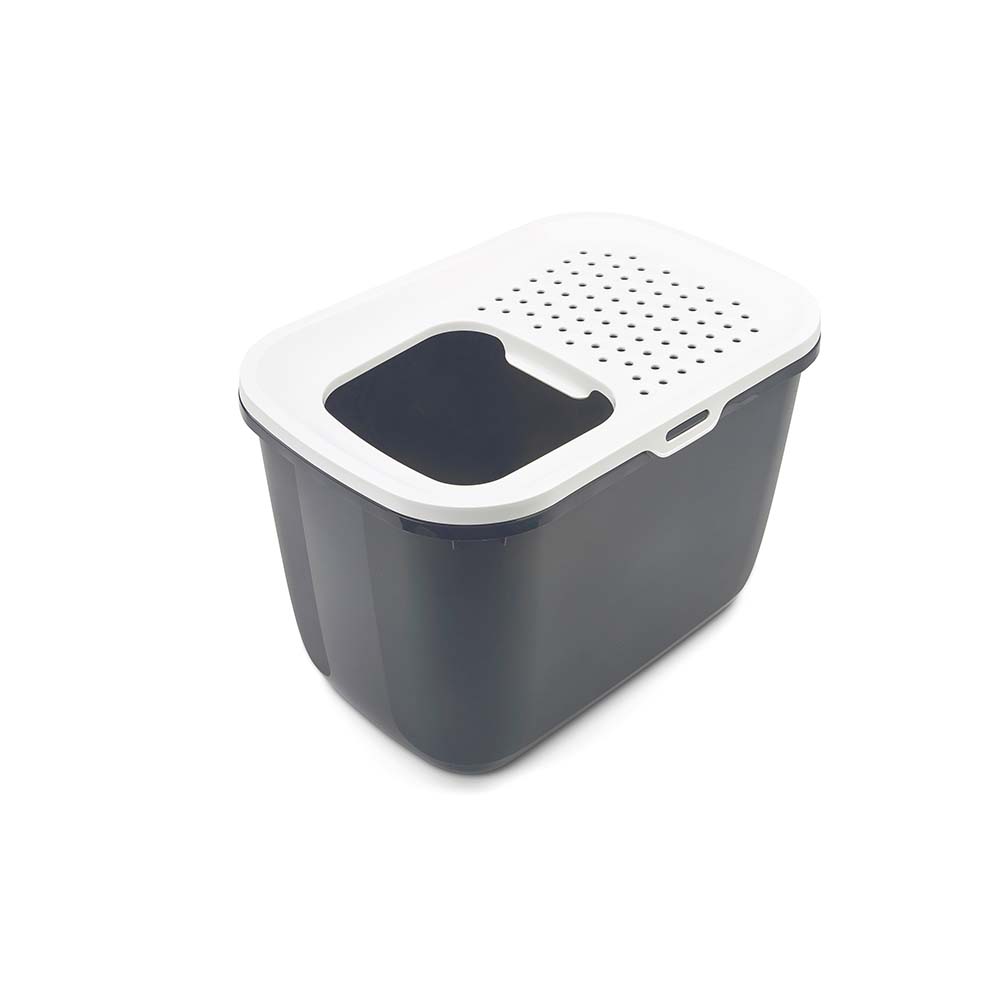 The HOP - IN is a closed litter box with a top-entry opening. The HOP - IN is ideal for pet owners with both dogs and cats as it keeps the cat's waste away from the dog. The most important feature of the HOP - IN is its perforated slightly sloped lid. As the cat walks along the lid, any litter falls back into the box through the small holes in the lid. This ensures that the area remains clean and tidy. The large opening allows easy access for all types of cats. Cleaning is an easy process thanks to the handles which facilitate its movement.