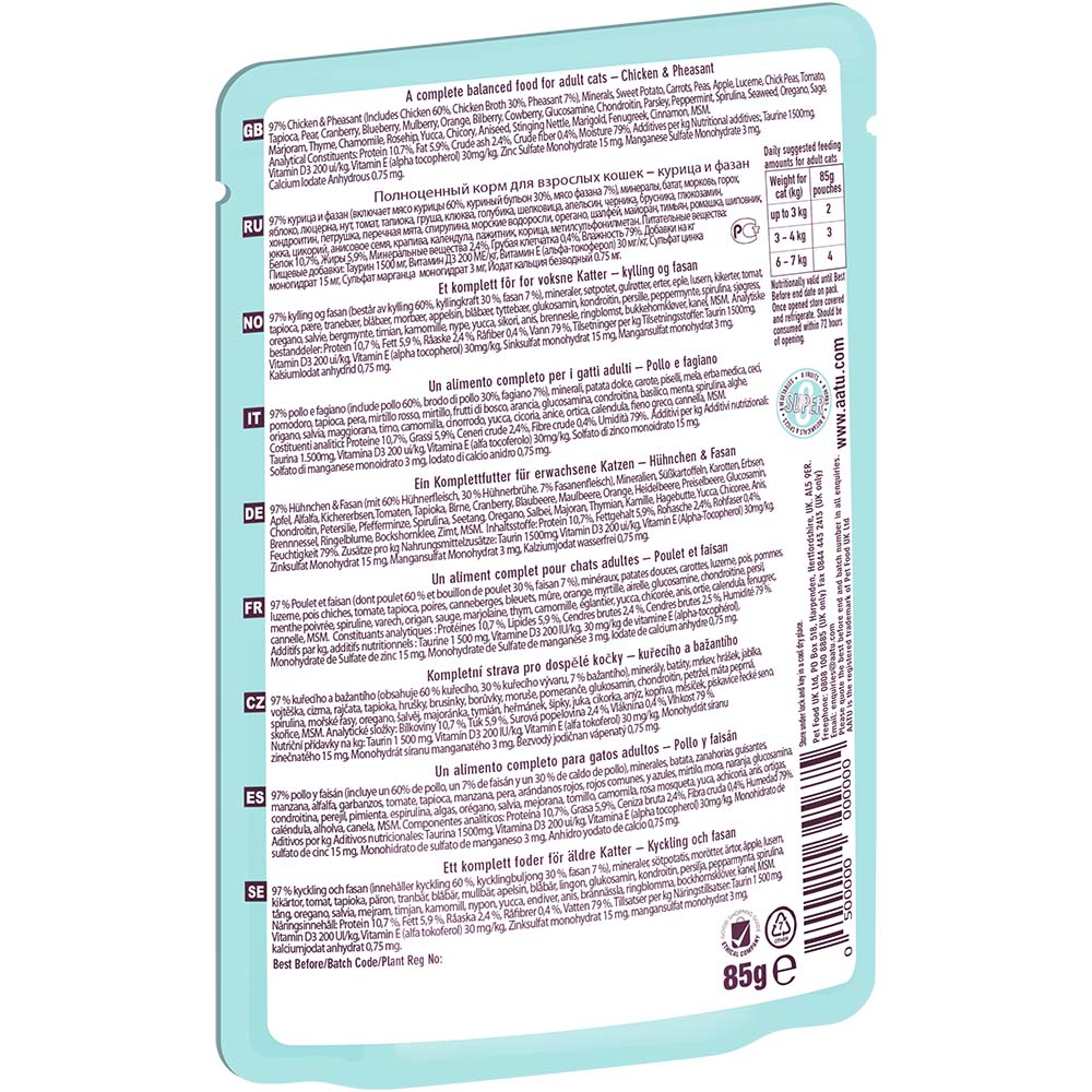 Συστατικά: Κοτόπουλο & Φασιανός 97% (κοτόπουλο 60%, ζωμός κοτόπουλου 30%, φασιανός 7%), μέταλλα, γλυκοπατάτα, καρότο, αρακάς, μήλο, τριφύλλι, ρεβίθι, ντομάτα, ταπιόκα, αχλάδι, cranberry, μύρτιλο, μούρο, πορτοκάλι, bilberry, κόκκινο μύρτιλο, γλυκοζαμίνη, χονδροϊτίνη, μαϊντανός, μέντα, σπιρουλίνα, φύκια, ρίγανη, φασκόμηλο, μαντζουράνα, θυμάρι, χαμομήλι, κυνόροδο, Yucca, κιχώρι, γλυκάνισο, τσουκνίδα, κατιφές, τριγωνέλλα, κανέλα.