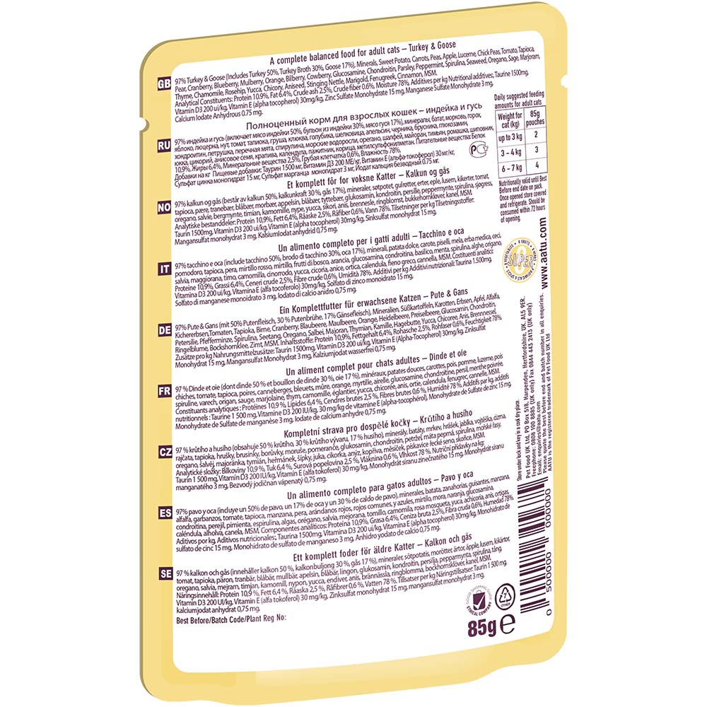 Συστατικά: Γαλοπούλα & χήνα 97% (γαλοπούλα 50%, ζωμός γαλοπούλας 30%, χήνα 17%), μέταλλα, γλυκοπατάτα, καρότο, αρακάς, μήλο, τριφύλλι, ρεβίθι, ντομάτα, ταπιόκα, αχλάδι, cranberry, μύρτιλο, μούρο, πορτοκάλι, bilberry, κόκκινο μύρτιλο, γλυκοζαμίνη, χονδροϊτίνη, μαϊντανός, μέντα, σπιρουλίνα, φύκια, ρίγανη, φασκόμηλο, μαντζουράνα, θυμάρι, χαμομήλι, κυνόροδο, Yucca, κιχώρι, γλυκάνισο, τσουκνίδα, κατιφές, τριγωνέλλα, κανέλα.