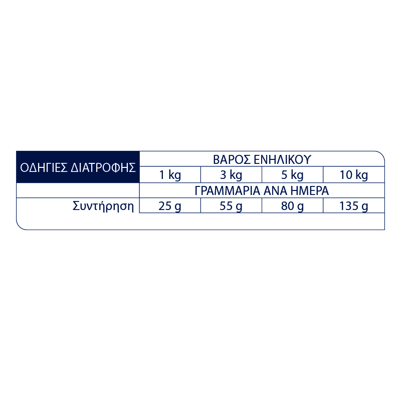 Συστατικά: Κοτόπουλο (15%), σίτος ολικής άλεσης (12%), αφυδατωμένες πρωτεΐνες πουλερικών, ρύζι (10%), ίνες μπιζελιών, σιτάλευρο, πρωτεΐνη αραβόσιτου, αφυδατωμένες πρωτεΐνες χοιρινού, αραβόσιτος ολικής άλεσης, υδρολυμένες ζωικές πρωτεΐνες (πουλερικά, χοιρινό, ψάρι), πίτυρα αραβόσιτου, πούλπα τεύτλων (1,7%), καλαμποκάλευρο, λίπος πουλερικών, ψιλά πίτυρα σίτου, ινουλίνη κιχωρίου (0,8%), ανόργανα συστατικά, ιχθυέλαιο, πρωτεΐνες χοιρινού πλάσματος (φυσική πηγή ανοσοσφαιρινών) (0,04%)