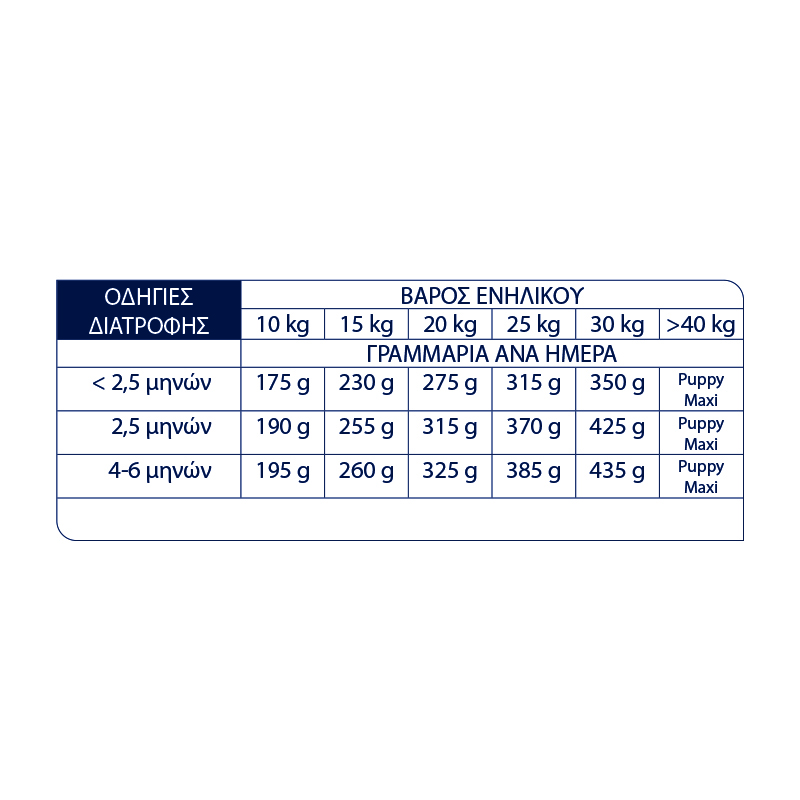 Συστατικά: Κοτόπουλο (20%), αφυδατωμένες πρωτεΐνες πουλερικών, ρύζι (10%), σίτος ολικής άλεσης (9%), πρωτεΐνη αραβόσιτου, αραβόσιτος ολικής άλεσης, καλαμποκάλευρο, λίπος πουλερικών, αφυδατωμένα μπιζέλια (4%), υδρολυμένες ζωικές πρωτεΐνες (πουλερικά, χοιρινό, ψάρι), αφυδατωμένες πρωτεΐνες χοιρινού, πούλπα τεύτλων (1,5%), ανόργανα συστατικά, ιχθυέλαιο, ινουλίνη κιχωρίου (0,4%), πρωτεΐνες χοιρινού πλάσματος (φυσική πηγή ανοσοσφαιρινών) (0,4%), συμπύκνωμα ζύμης (φυσική πηγή νουκλεοτιδίων) (0,04%).