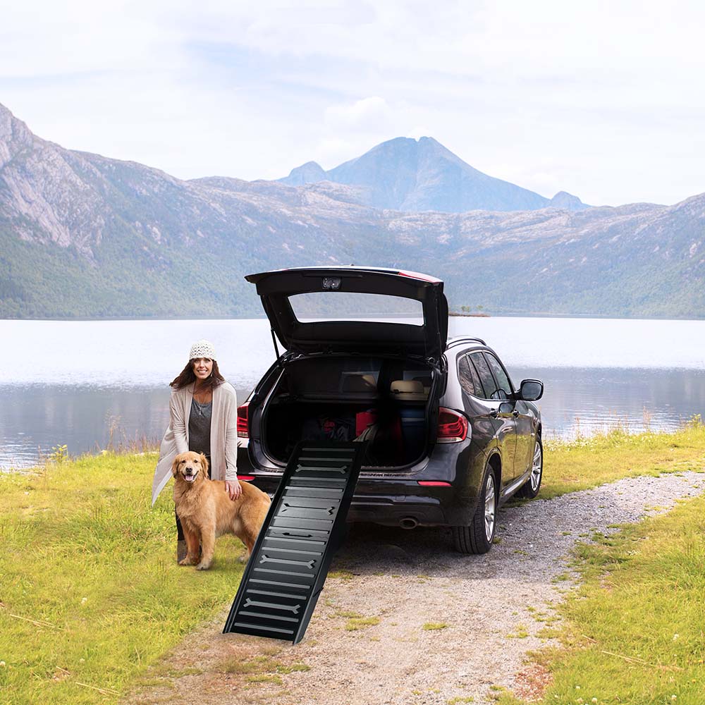 Πάρτε το σκύλο σας οπουδήποτε κι αν πάτε, το Travel Dog διαθέτει όλα όσα χρειάζεστε για να γίνει το κατοικίδιο σας ο καλύτερος συνοδός οδικού ταξιδιού είτε μέσω αυτοκινήτου είτε μέσω ποδηλάτου. Η εύκολη ράμπα για τα κατοικίδια προστατεύει τις αρθρώσεις των ζώων, συνίσταται ιδιαίτερα για κατοικίδια που πάσχουν από αρθρίτιδα. Μπορεί επίσης να χρησιμοποιηθεί για την πρόληψη προβλημάτων στο ισχίο και τη σπονδυλική στήλη. Η ράμπα για κατοικίδια έχει αντιολισθητική επιφάνεια και πλευρική ράβδο ασφαλείας, διευκολύνει την πρόσβαση στο αυτοκίνητο για το κατοικίδιο σας. Είναι αναδιπλούμενο για εύκολη αποθήκευση και ταιριάζει στο μεγαλύτερο μέρος των SUV, σεντάν και μίνι βαν. Μέγιστη αντοχή βάρους: 90 kg.