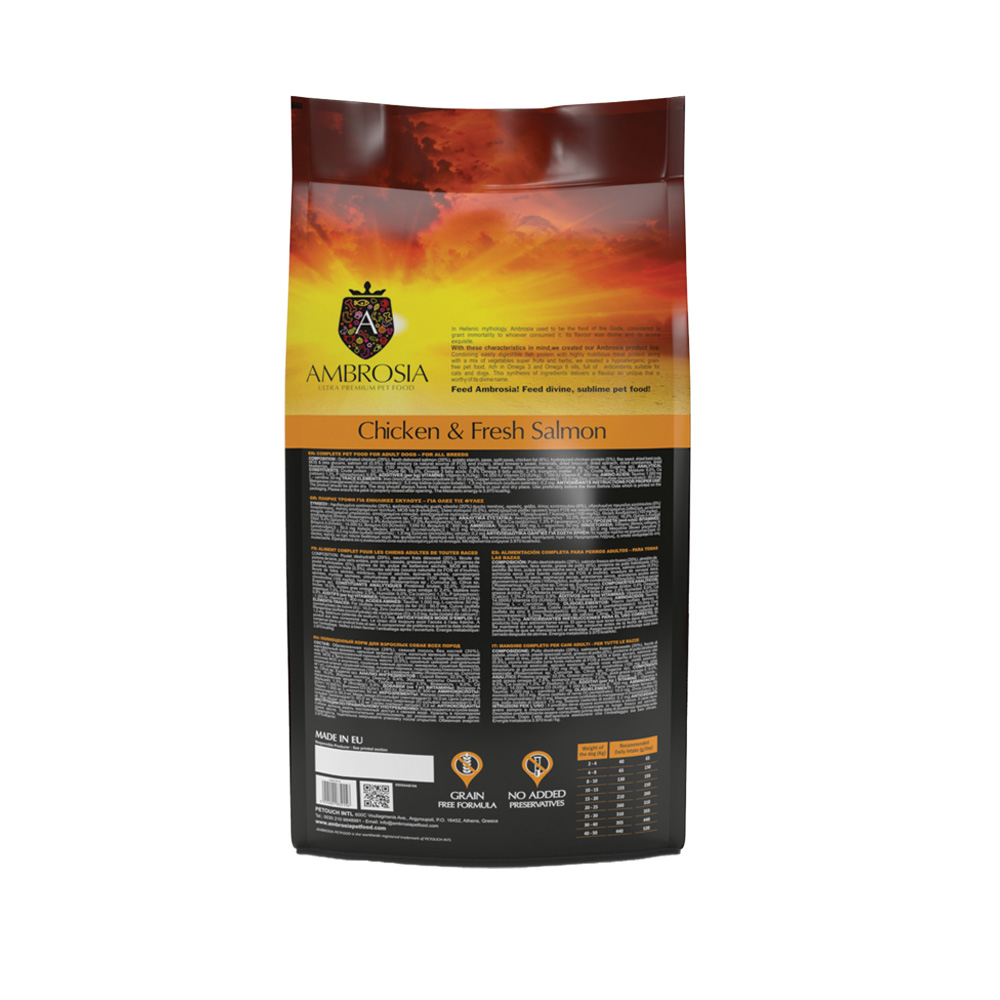 Συστατικά: Αφυδατωμένο Κοτόπουλο (29%), Φρέσκος Σολομός χωρίς κόκκαλο (20%), Άμυλο πατάτας, Αρακάς, Πολτός Αρακά, Λίπος Κοτόπουλου (6%), Υδρολυμένη Πρωτεΐνη Κοτόπουλου (5%), Λιναρόσπορος, Αφυδατωμένος Πολτός Τεύτλων, MOS & βήτα γλυκάνες, Λάδι Σολομού (0,5%), Φρουκτοολιγοσακχαρίτες FOS και Ινουλίνης, Αφυδατωμένη Μαγιά Μπύρας, Μέταλλα, Αφυδατωμένο Μπρόκολο, Αφυδατωμένο Σπανάκι, Αφυδατωμένα Cranberries, Αφυδατωμένα Βατόμουρα, Υδροχλωρική Γλυκοζαμίνη (100 mg/kg), Σουλφική χονδροϊτίνη (100 mg/kg), φυτικό εκχύλισμα (Rosemarinus sp, Vitis sp, Curcuma sp, Citrus sp, Eugenia sp).