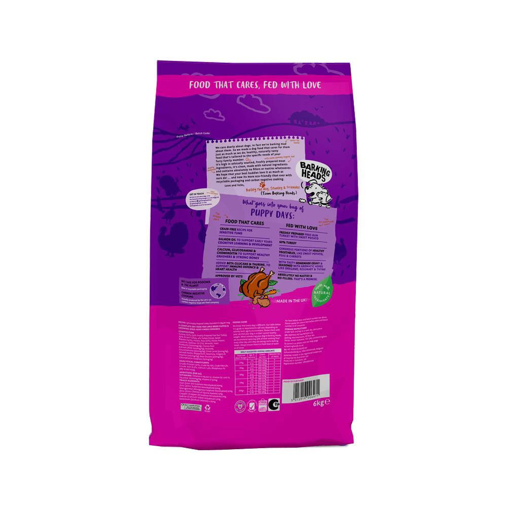 Συστατικά: Γαλοπούλα 60% (33% φρέσκοπαρασκευασμένη γαλοπούλα ελευθέρας βοσκής, 23% Αφυδατωμένη γαλοπούλα, 4% σάλτσα γαλοπούλας), γλυκοπατάτα (14%), πατάτα, αρακάς (10%), πρωτεΐνη πατάτας, λουκέρνη, λάδι σολομού ( 1%), μέταλλα, προϊόντα ζύμης (1000mg/kg), εκχύλισμα ρίζας κιχωρίου (FOS 1000mg/kg), φύκια, γλυκοζαμίνη (500mg/kg), Αφυδατωμένο καρότο (500mg/kg), μικτά βότανα (μέντα, δεντρολίβανο, ρίγανη & θυμάρι 500mg/kg), βήτα γλυκάνες (300mg/kg), θειική χονδροϊτίνη (150mg/kg).