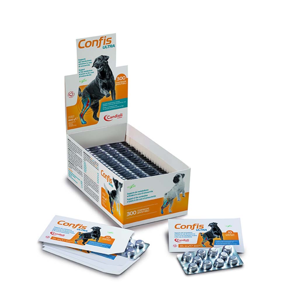 Συμπλήρωμα διατροφής με γλυκοζαμίνη, χονδροϊτίνη, υαλουρονικό οξύ και κολλαγόνο, για την αποκατάσταση της φυσιολογίας της άρθρωσης και την υποστήριξη του μεταβολισμού των αρθρώσεων του σκύλου, σε περίπτωση οστεοαρθρίτιδας (OA). Το Confis Ultra περιέχει: γλυκοζαμίνη [(χιτοζαμίνη από ζωικούς ιστούς (καθαρότητα > 99% & μοριακό βάρος 216 Da)] που βοηθά το σχηματισμό και αναγέννηση του αρθρικού χόνδρου, θειική χονδροϊτίνη (καθαρότητα 100% & μοριακό βάρος 16,9 kDa) που προστατεύει τους χόνδρους και τους δίνει ελαστικότητα, λιπαίνει τις αρθρώσεις και χάρη στην αντιφλεγμονώδη δράση της, μειώνει τον πόνο και το οίδημα, διατηρώντας τη λειτουργικότητα και την κινητικότητα των αρθρώσεων, υαλουρονικό οξύ (απορροφάται με από του στόματος χορήγηση) το οποίο συνεισφέρει στη συντήρηση του αρθρικού υγρού, απαραίτητο για την αποκατάσταση της ευκινησίας της άρθρωσης και εγγενές κολλαγόνο τύπου II (εξάγεται από στήθος κοτόπουλου) το οποίο παίζει σημαντικό ρόλο στην υγεία του ανοσοποιητικού καθώς συμβάλλει στη διατήρηση της ανοσοαπόκρισης.