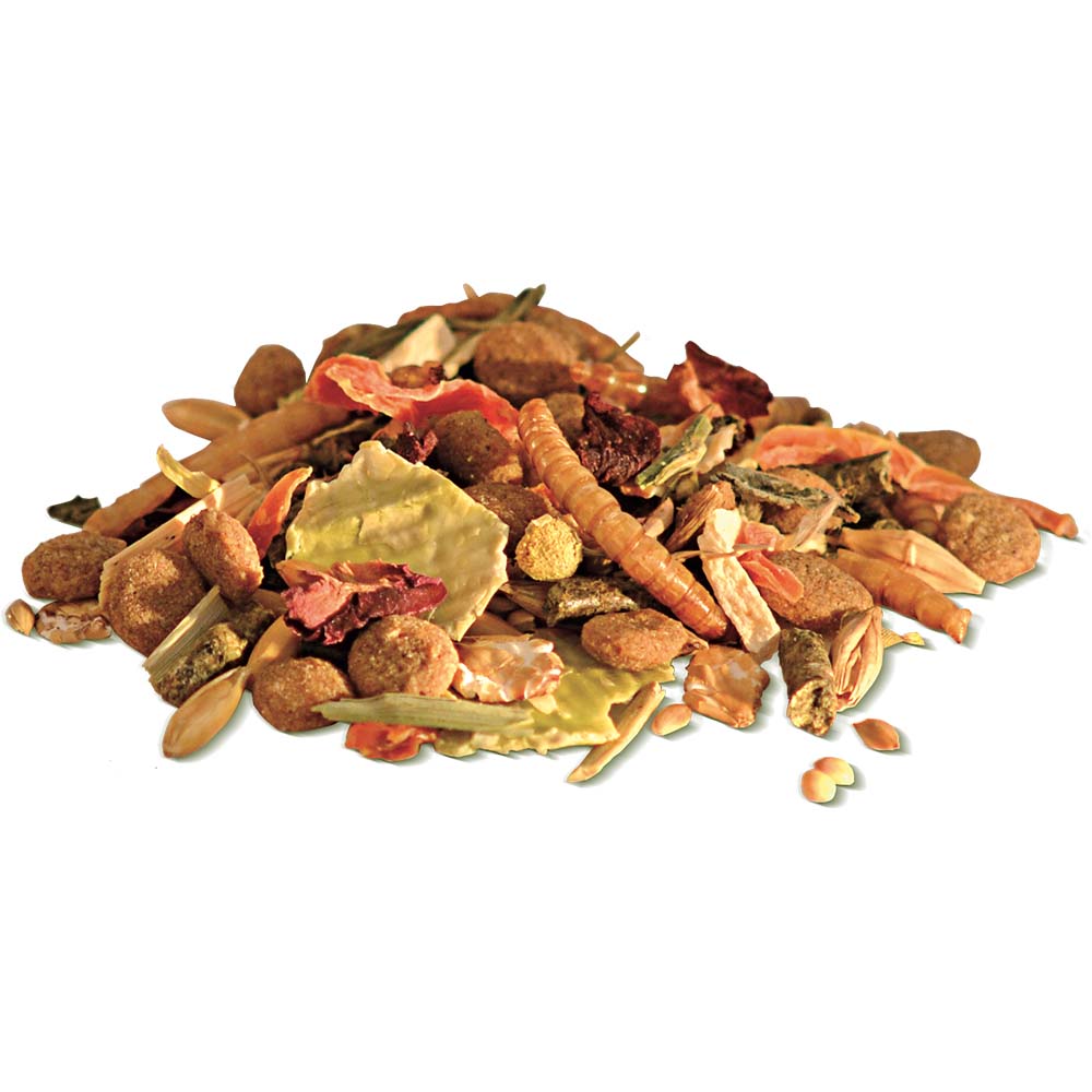 Συστατικά: Βρώμη, κριθάρι, κεχρί plata, μακρό κεχρί, νιφάδες μπιζελιών, καλαμπόκι, πίτουρο σίτου, νιφάδες βρώμης, νιφάδες κριθαριού, εκχύλισμα ηλιόσπορου, κεχρί λευκό, ρύζι, σιτάρι, μηδική η ήμερος - άλφα άλφα, καρότα, κρέας κοτόπουλου, κεχρί ερυθρό, σπόρος χλόης, δαύκος, πικραλίδα, ανθρακικό ασβέστιο, φύλλα αχιλλείας, αρνόγλωσσο το λογχοειδές, σπόροι ζυθοποιίας, σουσάμι, άνθη χαμομηλιού, λιναρόσπορος, πολτός καρότων, κοκκινογούλι, μαγιά ζυθοποιίας, ιχθυάλευρο ρέγγας, ζωικό λίπος, ινουλίνη, άνθη καλέντουλας, αλευροσκούληκα (0,3%), εκχύλισμα συκωτιού κοτόπουλου, πλήρες αυγό σε σκόνη, χαρούπι, λάδι σολομού, λινέλαιο, λεκιθίνη, ανθη τριαντάφυλλου.