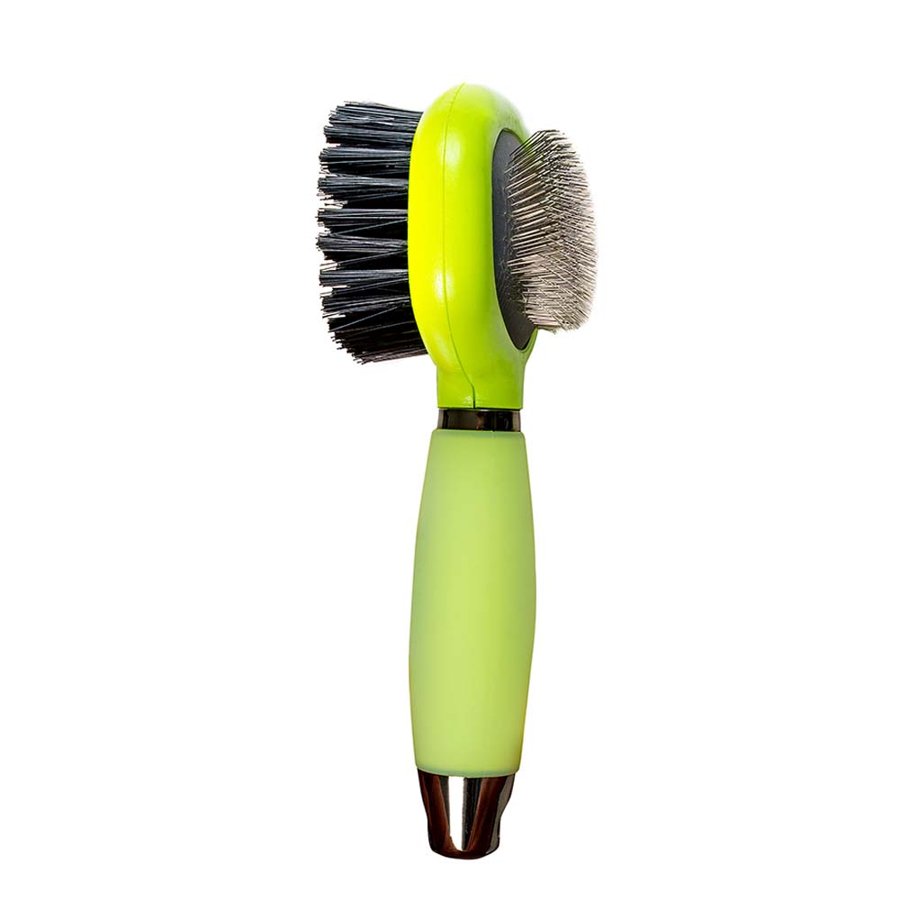 Βούρτσα οβάλ διπλής όψης, κατάλληλη για καθημερινή περιποίηση & όλους τους τύπους τριχώματος. Διαθέτει στη μία πλευρά μεταλλικές ακίδες για εύκολο ξεμπέρδεμα των κόμπων ενώ στην άλλη πλευρά οι μαλακές τρίχες αφαιρούν το νεκρό τρίχωμα και ταυτόχρονα διατηρούν τα φυσικά έλαια, μεταφέροντας τα σε όλο το μήκος της τρίχας. Με άνετη μαλακή λαβή.