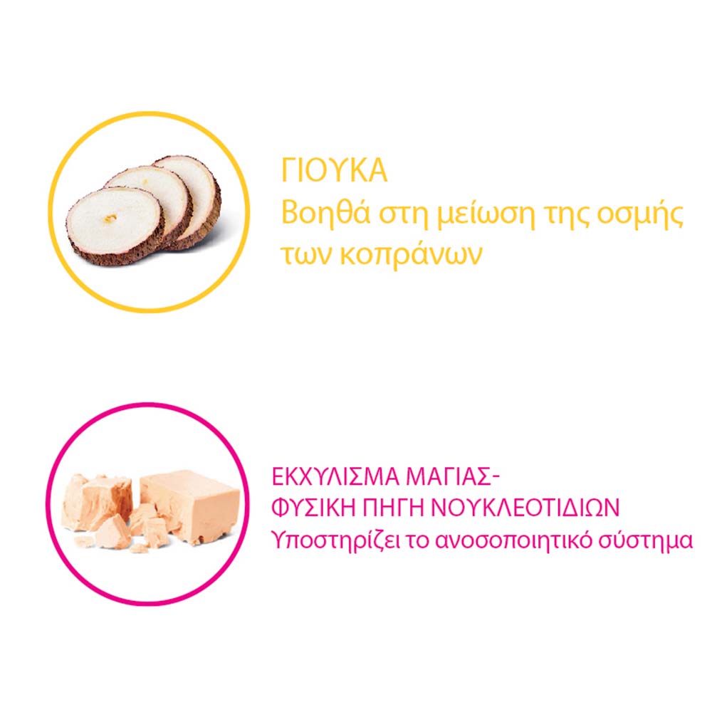 Συστατικά: Αφυδατωμένη πρωτεΐνη κοτόπουλου και γαλοπούλας, φρέσκο κοτόπουλο και κρέας γαλοπούλας 15% (κοτόπουλο 13,5%), ρύζι, ζωικά λίπη, αραβόσιτος, γεύμα καλαμποκιού «fioretto», γλουτένη αραβοσίτου, υδρολυμένη ζωική πρωτεΐνη, πολτός τεύτλων, σπόροι λιναριού, μαγιά 0,9%, ανόργανα συστατικά, αφυδατωμένες πρωτεΐνες ψαριών, ίνες μπιζελιού, MOS (μαννανο-ολιγοσακχαρίτες) 0,3%, εκχύλισμα αποξηραμένου ραδικιού, λιγνοκυτταρίνη, FOS (φρουκτο-ολιγοσακχαρίτες), βιοενεργά πεπτίδια κολλαγόνου 0,06%, εκχύλισμα μαγιάς μπύρας (νουκλεοτίδια) 0,03%, εκχύλισμα αποξηραμένης yucca schidigera 0,025%, εκχύλισμα αποξηραμένων εσπεριδοειδών (βοφλαβονοειδή) 0,006%, εκχύλισμα αποξηραμένου μήλου 0,003%.