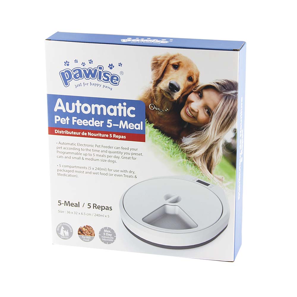 Αυτόματη ηλεκτρονική ταΐστρα 5 γευμάτων. Σας επιτρέπει να προγραμματίζετε τα γεύματα του αγαπημένου σας φίλου καθώς και τις μερίδες. Λειτουργεί με 4 μπαταρίες ΑΑ και το μόνο που έχετε να κάνετε είναι να γεμίσετε τους δίσκους τροφοδοσίας με ξηρά τροφή και να προγραμματίσετε τον χρόνο που το κατοικίδιο σας χρειάζεται να φάει. Ο χρόνος εναλλαγής μεταξύ των γευμάτων μπορεί να είναι από 1 λεπτό έως 23 ώρες και 59 λεπτά. Πρόκειται για μια μοντέρνα σχεδιασμένη αυτόματη ηλεκτρονική ταΐστρα σε πρακτικό μέγεθος ώστε να μην καταλαμβάνει πολύ χώρο και να το παίρνετε μαζί σας αν χρειαστεί. Είναι ανθεκτική σε πτώσεις και ιδιαίτερα εύκολη στο πλύσιμο.