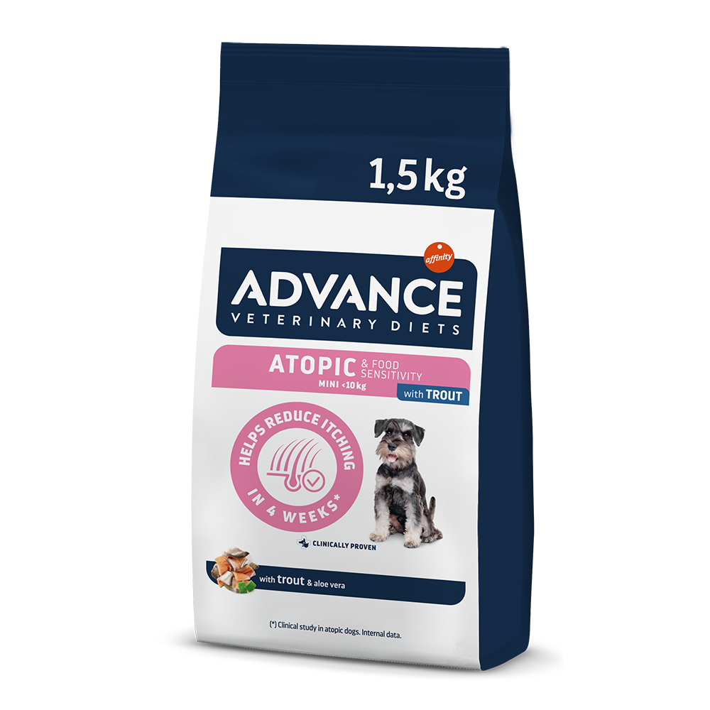 The Advance Veterinary Diet Dog Atopic Mini is a complete dietary dry food for adult dogs and puppies over 4 months of very small size, formulated for skin care in cases of dermatitis and excessive hair loss, as well as reducing ingredient and nutrient intolerances.