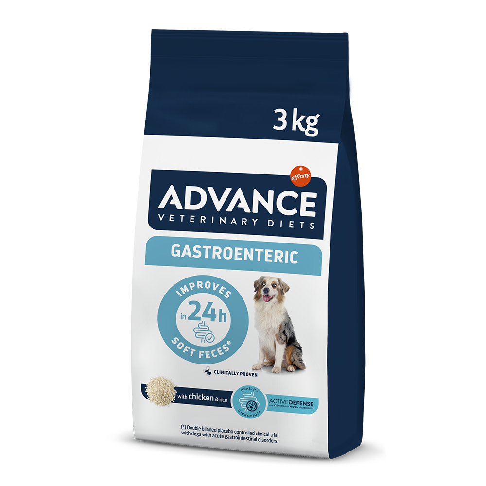 Advance Veterinary Diet Dog Gastroenteric is a complete dietary dry food for puppies and adult dogs, with easily digestible ingredients, low fat levels, and a higher ratio of sodium and potassium, helping reduce certain gastrointestinal disorders and in cases of exocrine pancreatic insufficiency.