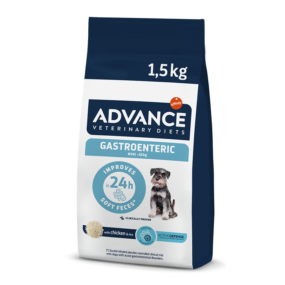 Its probiotic and prebiotic content helps improve intestinal microflora and strengthen the intestinal barrier. With an ultra-digestible formula to facilitate the absorption of essential nutrients. The results of Advance Veterinary Diet Gastroenteric Mini are clinically proven: Improves soft stools within 24 hours and reduces bowel movement frequency within 48 hours. With Advance Veterinary Diet Gastroenteric Mini, the risk of dysbiosis is 2 times lower.