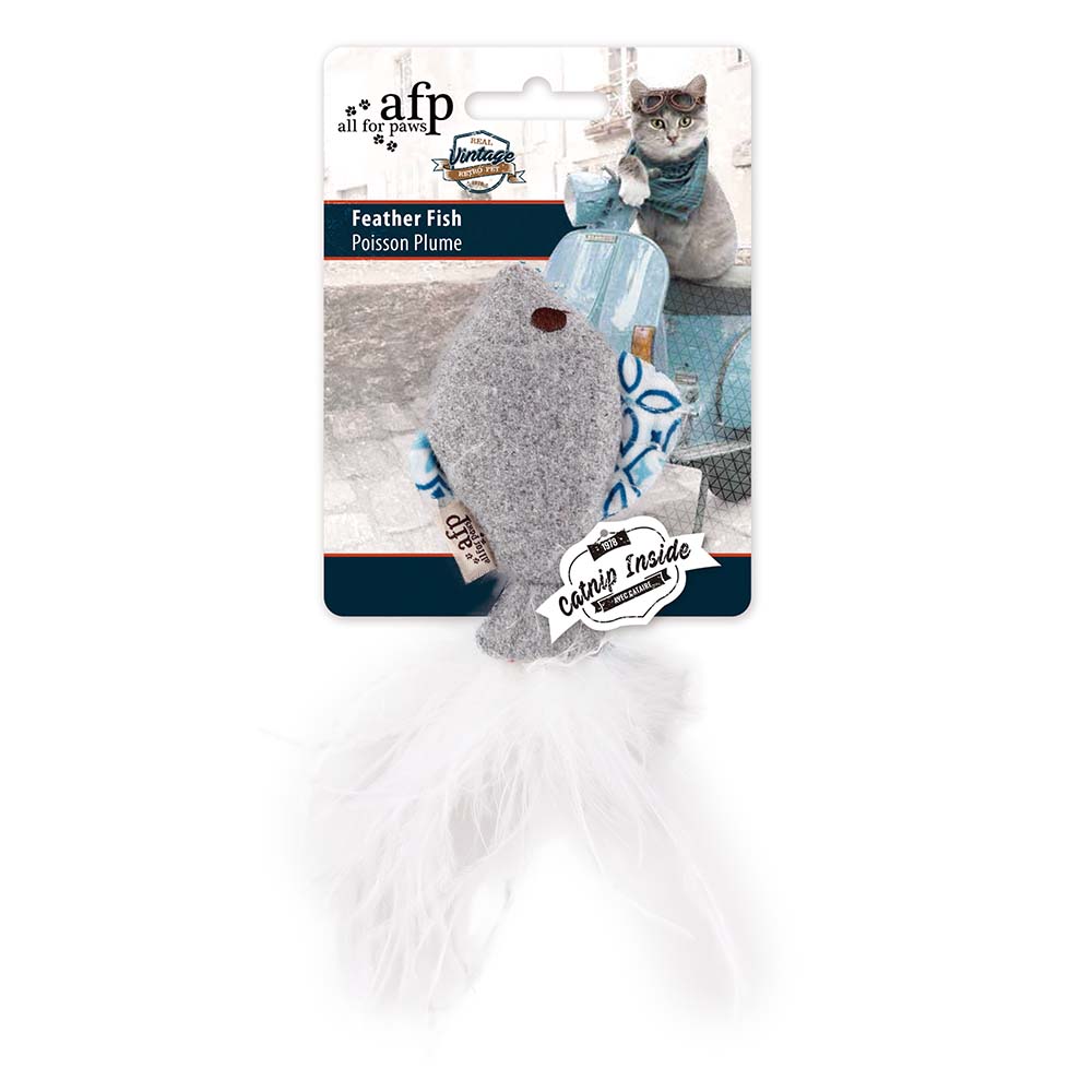 Retro-style toys filled with catnip. The Feather Fish will become your cat's favorite companion. They feature colorful fabrics inspired by home decorations to fit seamlessly into any home.