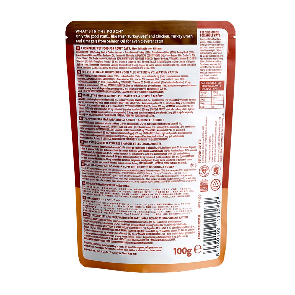 Ingredients: 93% Turkey, beef & chicken includes – Fresh deboned turkey (28%), fresh deboned beef (25%), turkey broth (25%), fresh deboned chicken (15%), sunflower oil, salmon oil, minerals.