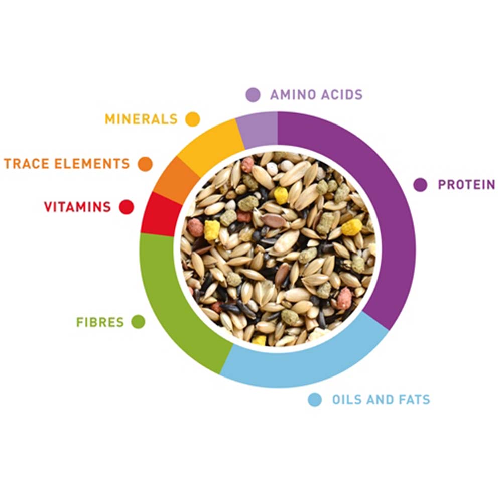 The Wellness series is a complete food created based on university research by nutritionists in collaboration with breeders, aiming to provide the necessary ingredients for proper and complete nutrition for every bird. It includes a blend of seeds and other selected natural ingredients. Contains shells that aid digestion, as well as natural components such as wild seeds, herbs, vegetables, fruits, eggs, and nuts.