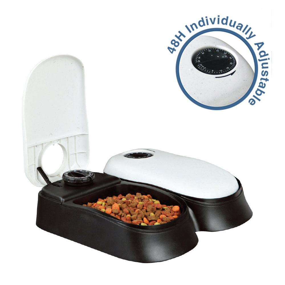 Automatic double feeder and waterer for your beloved pet. Allows you to schedule the time and portion for your dog or cat, ensuring your pet eats when and how much it needs. Additionally, it features a water filtration system to keep water fresh with continuous flow. It is drop-resistant and very easy to clean.