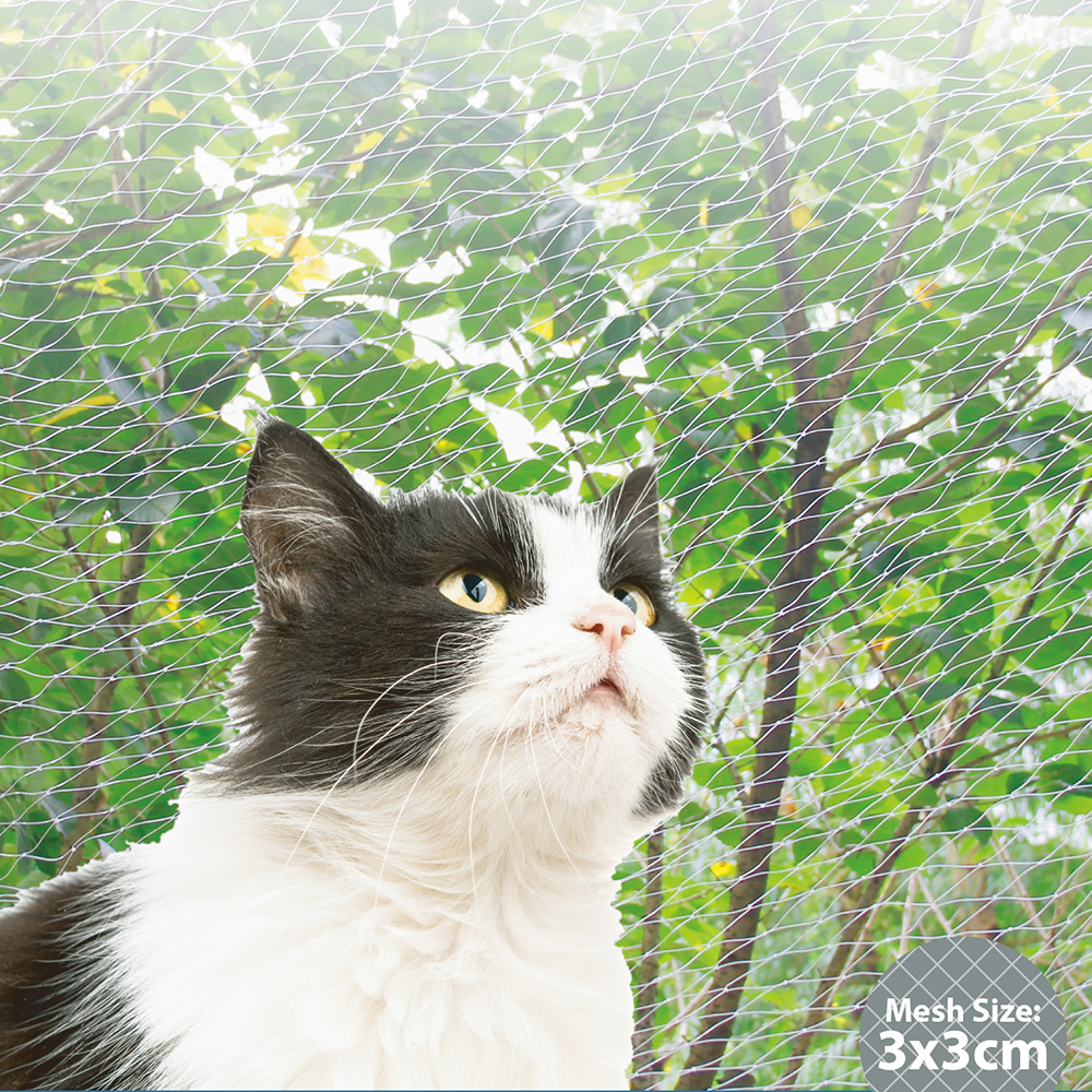 Transparent balcony safety net. The durable nylon construction threads ensure your cat's safety without the risk of falling from the balcony. It is transparent so the view is not obstructed and is particularly resistant to UV radiation and weather conditions. Easily assembled and fits any balcony.