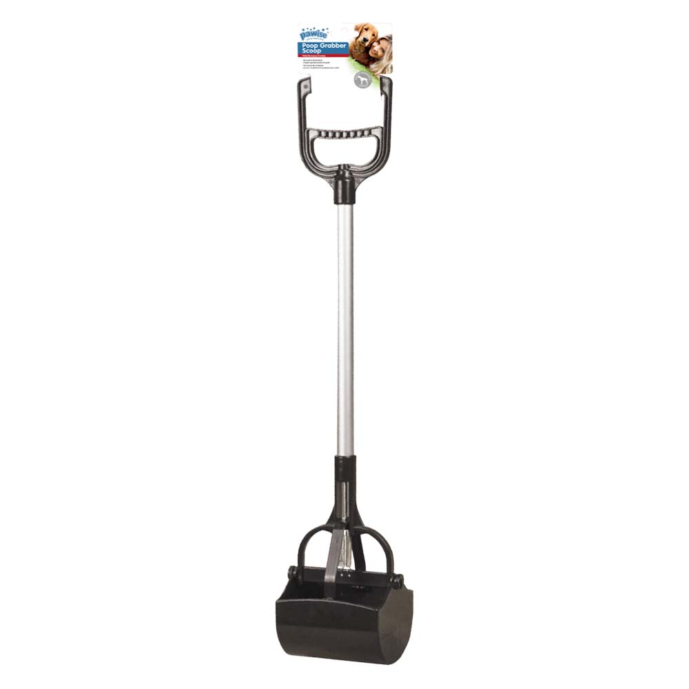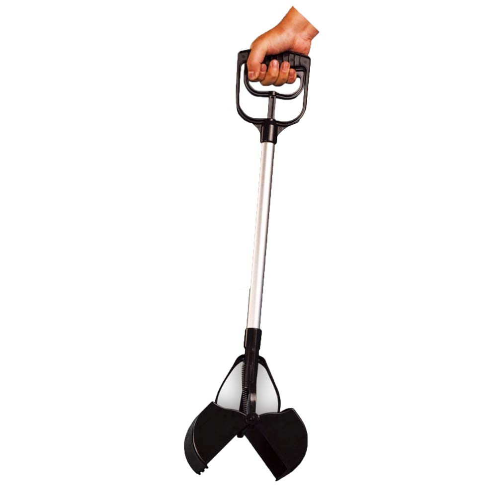 Waste collector with a total length of 73cm. The two parts of the handle are pressed together and the bin opens. When the handle is released, the scoop closes and collects the waste. The bin's mechanism works perfectly on grass, cement, and other surfaces.