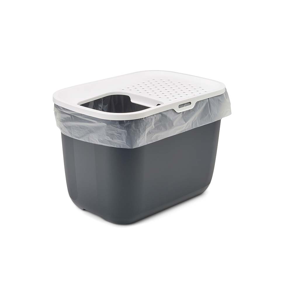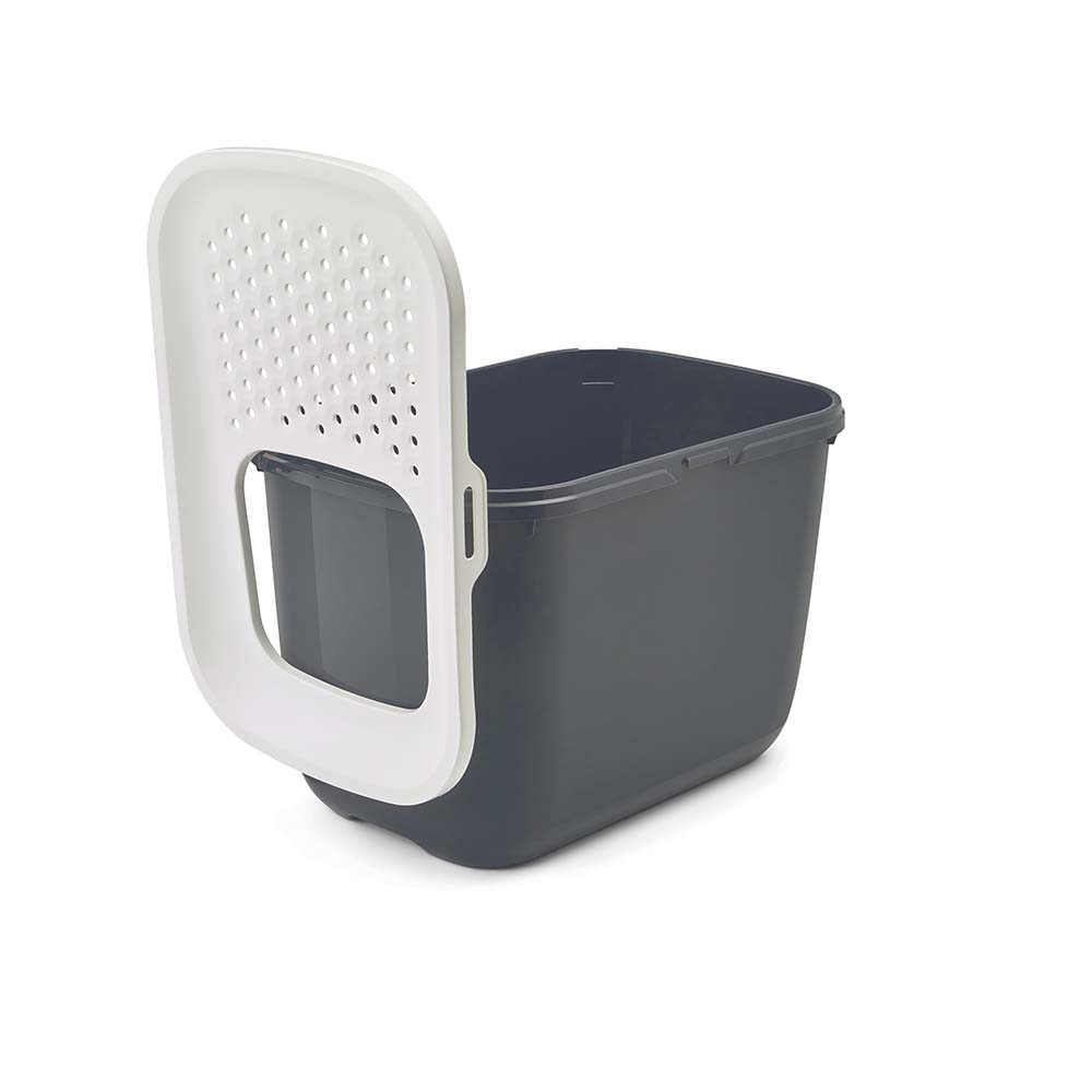 The HOP - IN is a closed litter box with a top-entry opening. The HOP - IN is ideal for pet owners with both dogs and cats as it keeps the cat's waste away from the dog. The most important feature of the HOP - IN is its perforated slightly sloped lid. As the cat walks along the lid, any litter falls back into the box through the small holes in the lid. This ensures that the area remains clean and tidy. The large opening allows easy access for all types of cats. Cleaning is an easy process thanks to the handles which facilitate its movement.