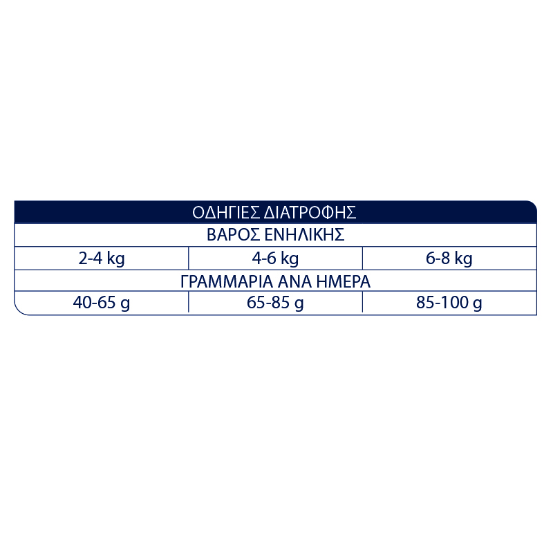 Συστατικά: Κοτόπουλο (21%), αραβόσιτος, αφυδατωμένες πρωτεΐνες πουλερικών, πρωτεΐνες αραβοσίτου, ρύζι (8%), ζωικό λίπος, αφυδατωμένες πρωτεΐνες χοιρινού κρέατος, υδρολυμένες ζωικές πρωτεΐνες, ιχθυέλαιο, κιτρικό κάλιο, πρωτεΐνες πλάσματος, φυσικά πηγή ανοσοσφαιρινών (0,5%), χλωριούχο κάλιο, αλάτι, φυσικές πολυφαινόλες.