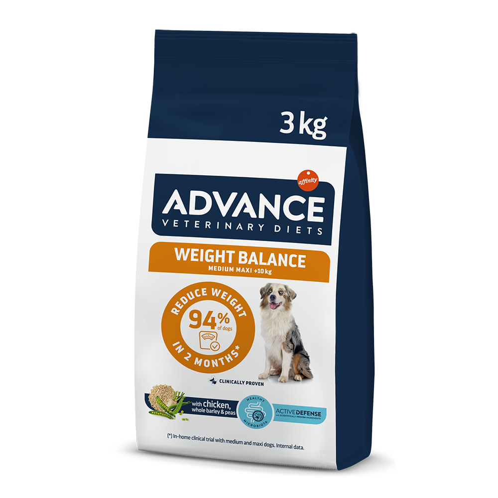 Η Advance Veterinary Diet Dog Weight Balance είναι μια διαιτητική πλήρης ξηρά διατροφή για ενήλικες μεσαίου και μεγάλου μεγέθους σκύλους, με μειωμένη μεταβολιζόμενη ενέργεια για τη μείωση του υπερβολικού σωματικού βάρους και με χαμηλό επίπεδο λίπους για την υποστήριξη του μεταβολισμού των λιπιδίων σε περίπτωση υπερλιπιδαιμίας.