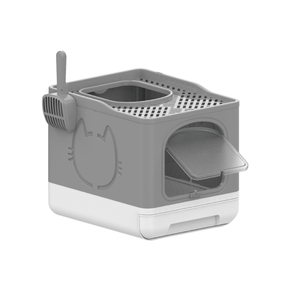 Τουαλέτα για γάτες νέας γενιάς. Η τουαλέτα διαθέτει δύο τύπων εισόδους, πόρτα στα πλαϊνά και ανοικτή από πάνω, για να καλύψει κάθε ανάγκη της γάτας σας. Η μπροστινή είσοδος μπορεί να κλειδώσει για επιπλέον ασφάλεια. Αποθηκεύεται, καθαρίζεται και μεταφέρεται εύκολα. Χρώμα: Γκρι.