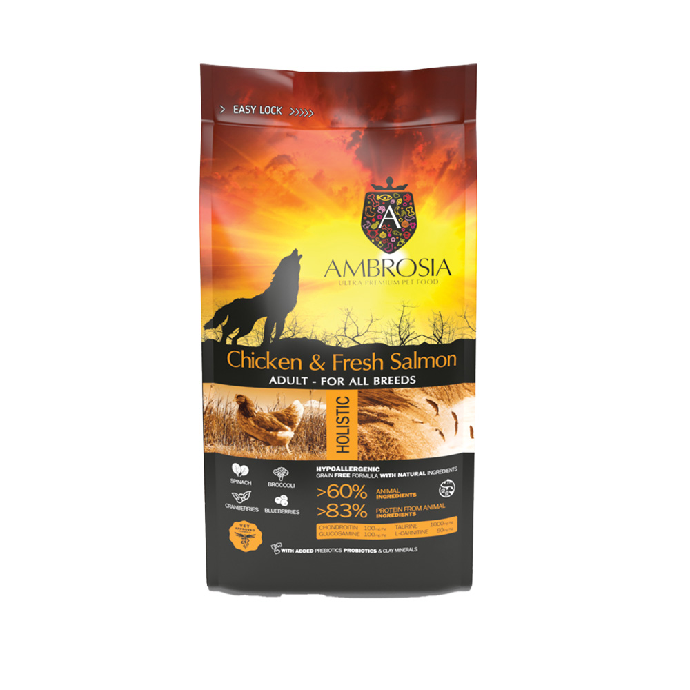 Συστατικά: Αφυδατωμένο Κοτόπουλο (29%), Φρέσκος Σολομός χωρίς κόκκαλο (20%), Άμυλο πατάτας, Αρακάς, Πολτός Αρακά, Λίπος Κοτόπουλου (6%), Υδρολυμένη Πρωτεΐνη Κοτόπουλου (5%), Λιναρόσπορος, Αφυδατωμένος Πολτός Τεύτλων, MOS & βήτα γλυκάνες, Λάδι Σολομού (0,5%), Φρουκτοολιγοσακχαρίτες FOS και Ινουλίνης, Αφυδατωμένη Μαγιά Μπύρας, Μέταλλα, Αφυδατωμένο Μπρόκολο, Αφυδατωμένο Σπανάκι, Αφυδατωμένα Cranberries, Αφυδατωμένα Βατόμουρα, Υδροχλωρική Γλυκοζαμίνη (100 mg/kg), Σουλφική χονδροϊτίνη (100 mg/kg), φυτικό εκχύλισμα (Rosemarinus sp, Vitis sp, Curcuma sp, Citrus sp, Eugenia sp).