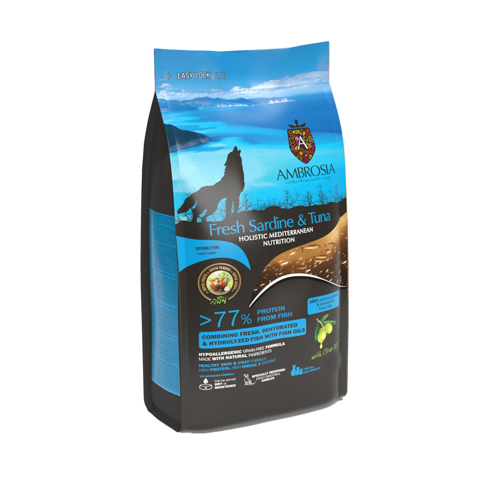 Η συνταγή μας Fresh Sardine & Tuna της σειράς Ambrosia Mediterranean Diet συνδυάζει την εύπεπτη πρωτεΐνη ψαριού που προέρχεται από τα φιλέτα φρέσκιας σαρδέλας μαζί με τον πυκνό σε πρωτεΐνες τόνο. Με τη σωστή ποσότητα ελαιόλαδου και ένα μείγμα μεσογειακών φρούτων και βοτάνων, προσφέρουμε μια υποαλλεργική, μεσογειακού τύπου, χωρίς σιτηρά τροφή για σκύλους, γεμάτη αντιοξειδωτικά, κατάλληλη για όλες τις ράτσες σκύλων. Το άρωμα και η γεύση που προσφέρει ο συνδυασμός των συστατικών ανθρώπινης ποιότητας είναι βέβαιο ότι θα ενθουσιάσει τον σκύλο σας, ενώ παράλληλα προσφέρει μια ολιστική διατροφή που εξασφαλίζει υγεία και μακροζωία.