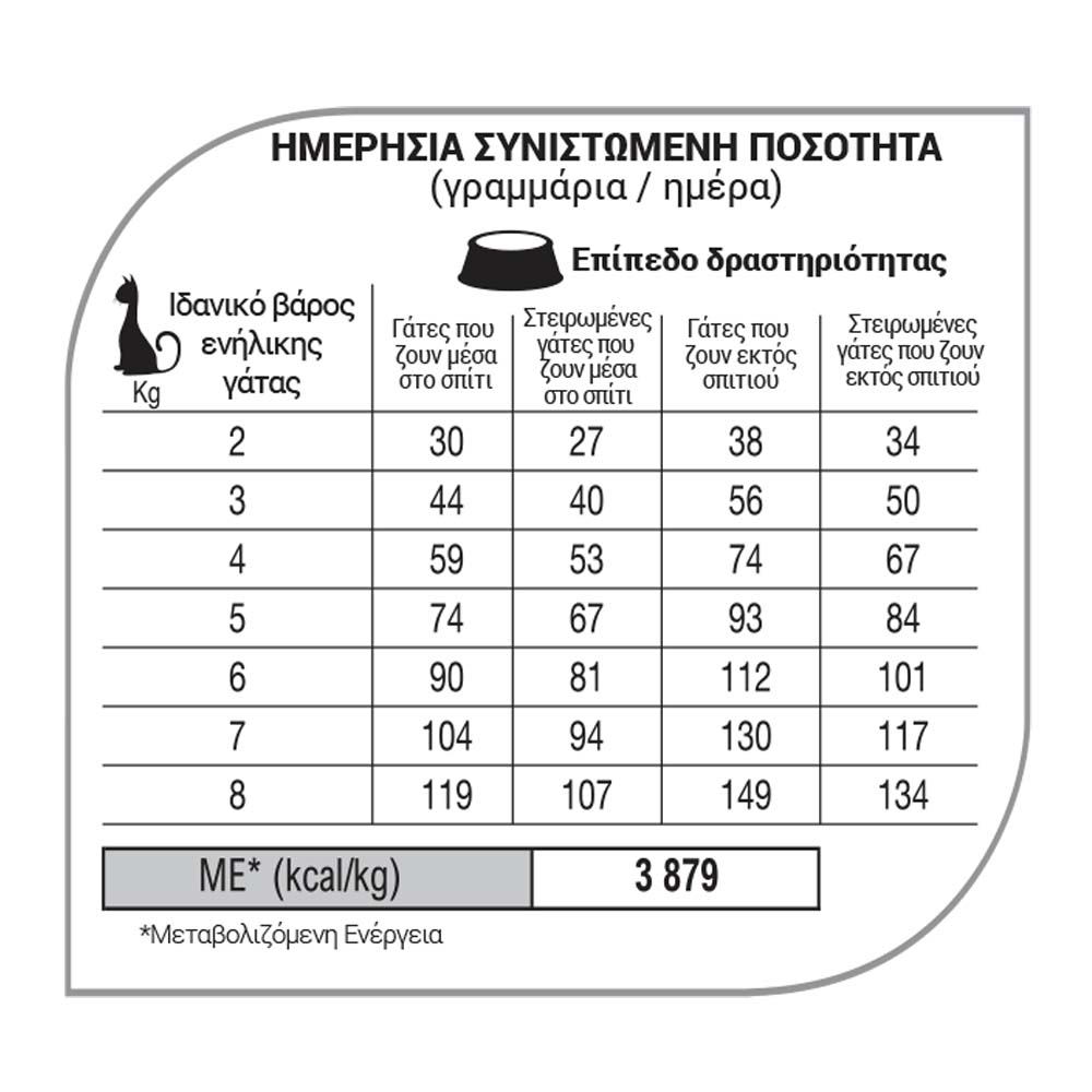 Αναλυτικά συστατικά (%): Πρωτείνη: 33%, λιπαρά: 16%, ολικές ινώδεις ουσίες: 3%, ολική τέφρα: 7,5%, ασβέστιο: 1,3%, φώσφορος: 0,9% - ανά kg: Λιπαρά οξέα Ω3: 2,8 g, λιπαρά οξέα Ω6: 30g, ταυρίνη 0,18%.