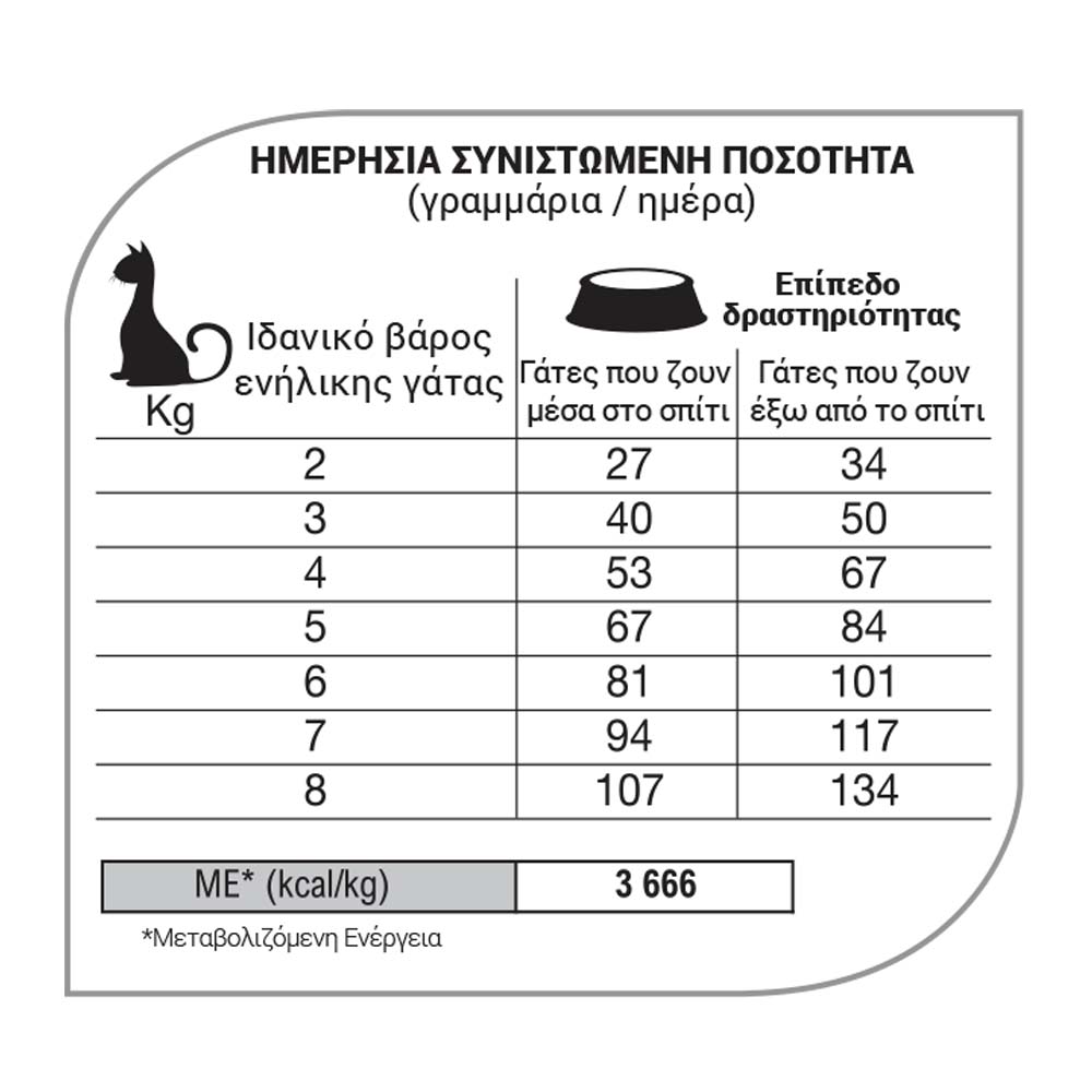 Συστατικά: Αφυδατωμένα πουλερικά, ρύζι, αραβόσιτος, μπιζέλια, κατάλοιπα ζωικού λίπους, λίπος πουλερικών, υδρολυμένη ζωική πρωτεΐνη, φυτικές ίνες, πούλπα τεύτλων, αβγό σε σκόνη, πολτός ραδικιού (0,9 % - πηγή FOS 0,54 %), ιχθυέλαιο, πούλπα πατάτας, μαγιά μπίρας, εξαμεταφωσφορικό νάτριο (0,3 %), ανόργανα άλατα, φλοιός ψύλλιου, εκχύλισμα γιούκα, μαννοολιγοσακχαρίτες (MOS 0,03 %).