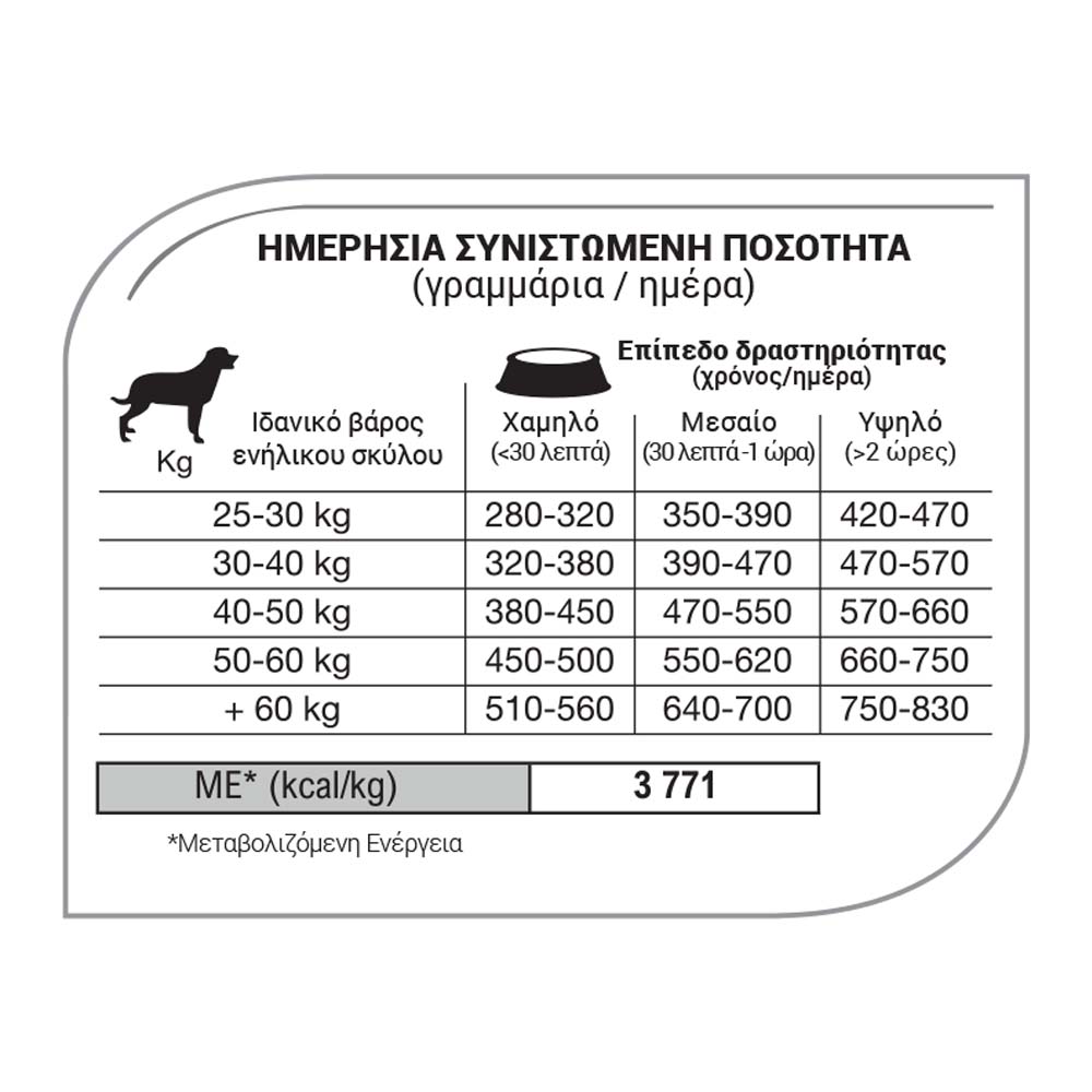 Αναλυτικά συστατικά (%): Πρωτεΐνη 25%, Λιπαρά 15%, Ολικές ινώδεις ουσίες 2%,   Τέφρα 7%, Ασβέστιο 1,3%, Φώσφορος 1%, Ταυρίνη 2gr.