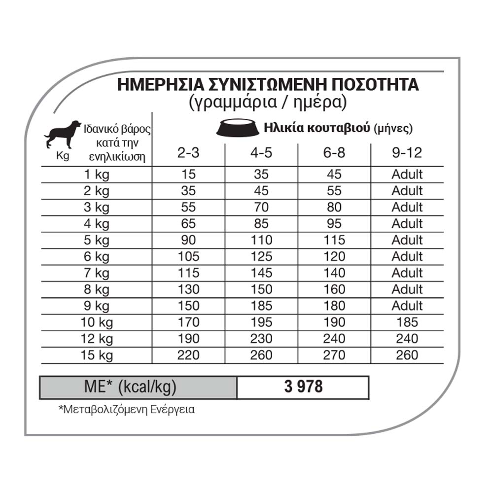 Συστατικά: Αφυδατωμένα πουλερικά, ρύζι, καλαμπόκι, λίπος πουλερικών, σιτάρι, μπιζέλια, υδρολυμένη πρωτεΐνη κρέατος, πολτός τεύτλων, φυτικές ίνες, αραβόσιτoς, αυγό, ιχθυέλαιο, μαγιά μπύρας, φωσφορικό νάτριο, ινουλίνη, μαννοολιγοσακχαρίτες, ανόργανα άλατα, φρουκτοολιγοσακχαρίτες, εκχύλισμα yucca.