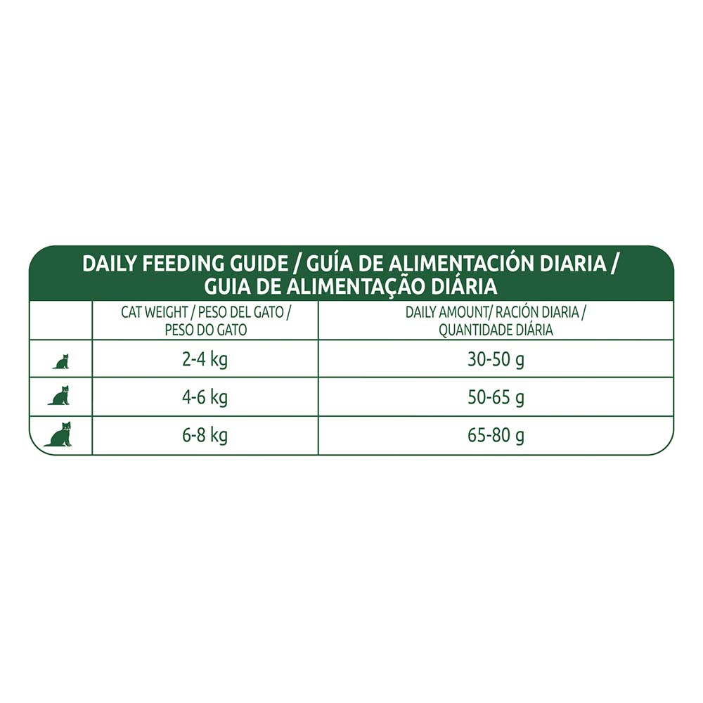 Αναλυτικά συστατικά (%): Πρωτεΐνη 35%, Λίπος 11,7%, Ακατέργαστες ίνες 5%, Ορυκτά 7,5%, Ασβέστιο 1,1%, Φώσφορος 0,9%, Υγρασία 6%, Νάτριο 0,7%, Κάλιο 0,78, Μαγνήσιο 0,11%, Ωμέγα 3 0,11%, Ωμέγα 6 1,5%, Ταυρίνη  700 mg.