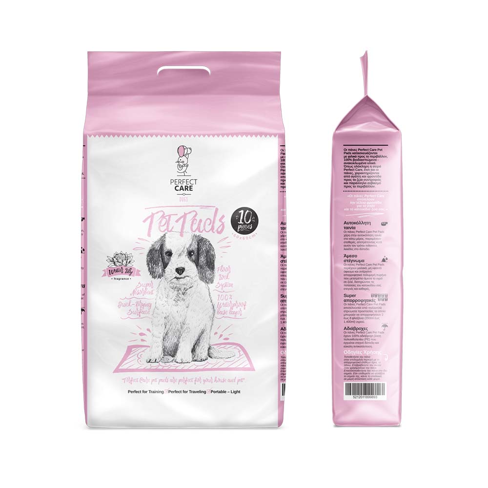 Οι πάνες Perfect Care Pet Pads κατασκευάζονται με φιλικά προς το περιβάλλον, 100% βιοδιασπώμενα – ανακυκλωμένα υλικά, Water Lily. Διαθέτουν αυτοκόλλητη ταινία στο κάτω μέρος, παραμένουν σταθερές, αποτρέποντας κατά αυτόν τον τρόπο πιθανούς λεκέδες στο δάπεδο. Περιέχουν μαλακό, μη υφαντό ύφασμα και ανόργανο απορροφητικό πολυμερή πυρήνα που μετατρέπει άμεσα το υγρό σε ζελέ, διατηρώντας τις πατούσες του κατοικιδίου σας στεγνές και καθαρές. Είναι Super απορροφητικές καθώς αποτελούνται από πολλαπλά στρώματα προστασίας τα οποία μπορούν να απορροφήσουν 2 έως 8 φλιτζάνια υγρού. Έχουν 100% αδιάβροχη βάση πολυαιθυλενίου που εγγυάται στεγνό δάπεδο και εύκολη αντικατάσταση.